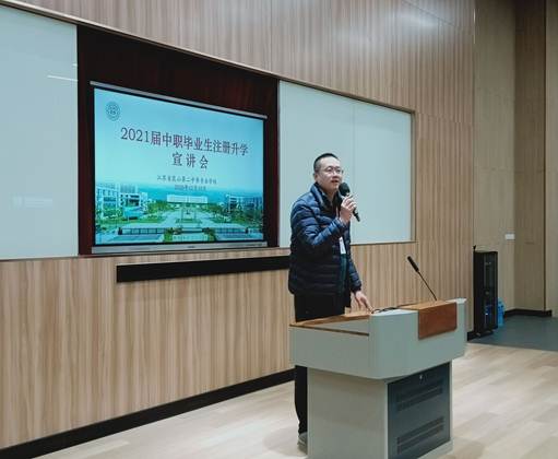 为了更好地宣传中职毕业生注册升学政策,不断提升学生的学历层次。12月10日下午13点15分,在至善楼323阶梯教室,由盐城工业职业技术学院、苏州健雄职业技术学院、常州纺织服装职业技术学院、江苏商贸职业学院、硅湖职业技术学院、昆山登云科技职业学院、苏州托普信息职业技术学院、苏州工业园区职业技术学院、江苏信息职业技术学院九所院校招就部门负责人组成的宣讲团,对我校2021届中职毕业生进行注册升学宣讲活动,学工处王亮副主任主持宣讲会。