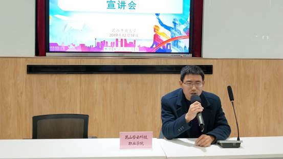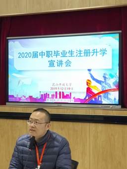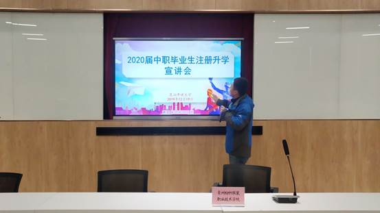 为了更好地宣传中职毕业生注册升学政策,将优质院校的学校概况、招生政策、优势学科专业更好的传达给学生,助力学生未来的学业生涯规划,12月19日下午13点15分,在至正楼325阶梯教室,由昆山登云科技职业学院、苏州工业园区职业技术学院、南通职业大学、常州纺织服装职业技术学院、无锡工艺职业技术学院的五所院校招就部门负责人组成的宣讲团,对2020届中职毕业生进行注册升学宣讲活动,学工处王亮副主任主持宣讲会。